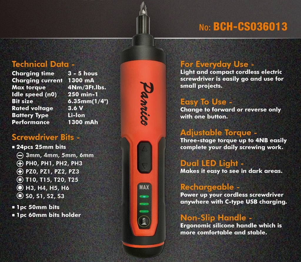 Panrico 3.6V Coreless Screwdriver, a wireless charging screwdriver that allows you to easily handle various screw fastening tasks. Whether it's for home repairs, furniture assembly, or DIY projects, our electric screwdriver features interchangeable bit sets and lightweight portability, ensuring efficient and accurate operation. Choose Baileys' 3.6V electric screwdriver for a convenient and reliable screw fastening solution.